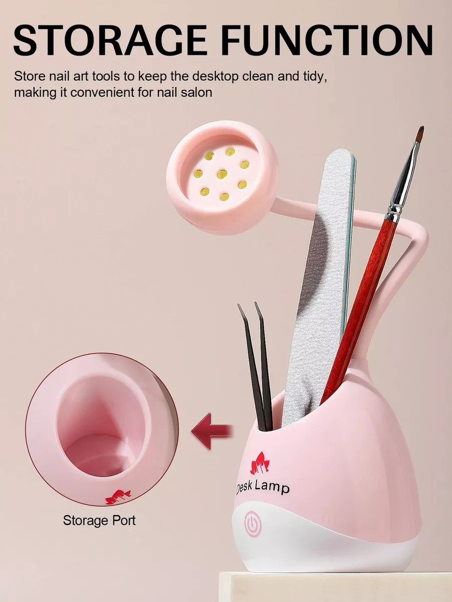 Lámpara compacta ideal para manicura en casa. Cuenta con 8 LEDs UV para un secado uniforme y un cuello ajustable 360° para dirigir la luz al ángulo que necesites. Su alimentación tipo C la hace práctica para usar en cualquier lugar.